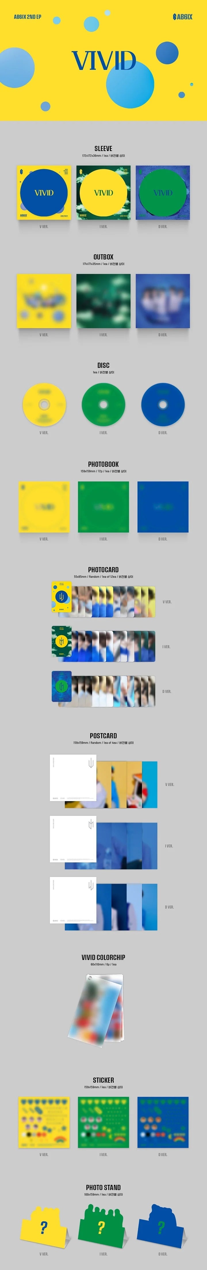 Includes: CD, Photobook, Photocard (Random 1 out of 12), Postcard (Random 1 out of 4), Vivid Colourchips, Sticker, Photo Stand